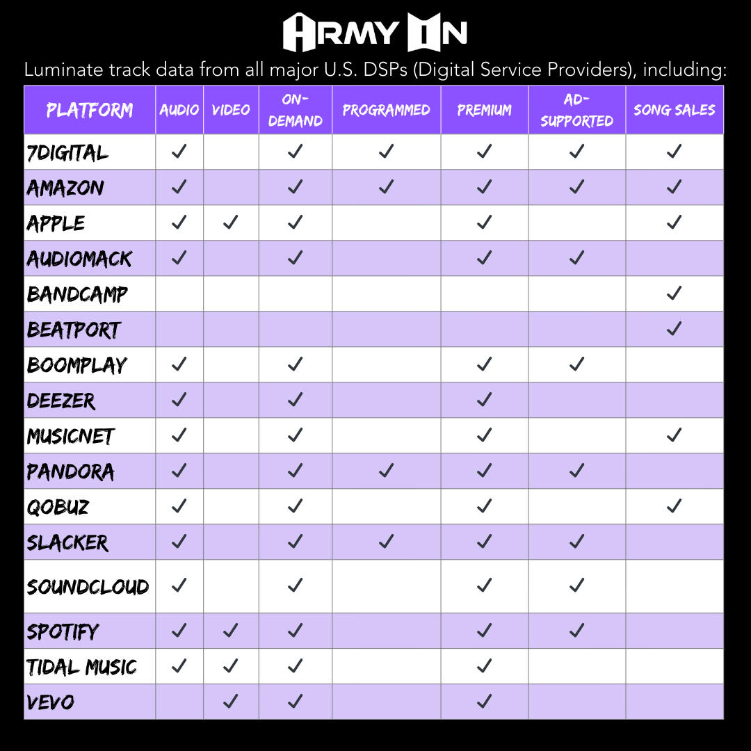 | Pandora (US only) | ARMYonPandora/ARMYonPandas | ARMYonPandora/ARMYonPandas | ARMYonPandora/ARMYonPandas | ARMYonPandora | ARMYonPandora /ARMYonPandas | - | - |