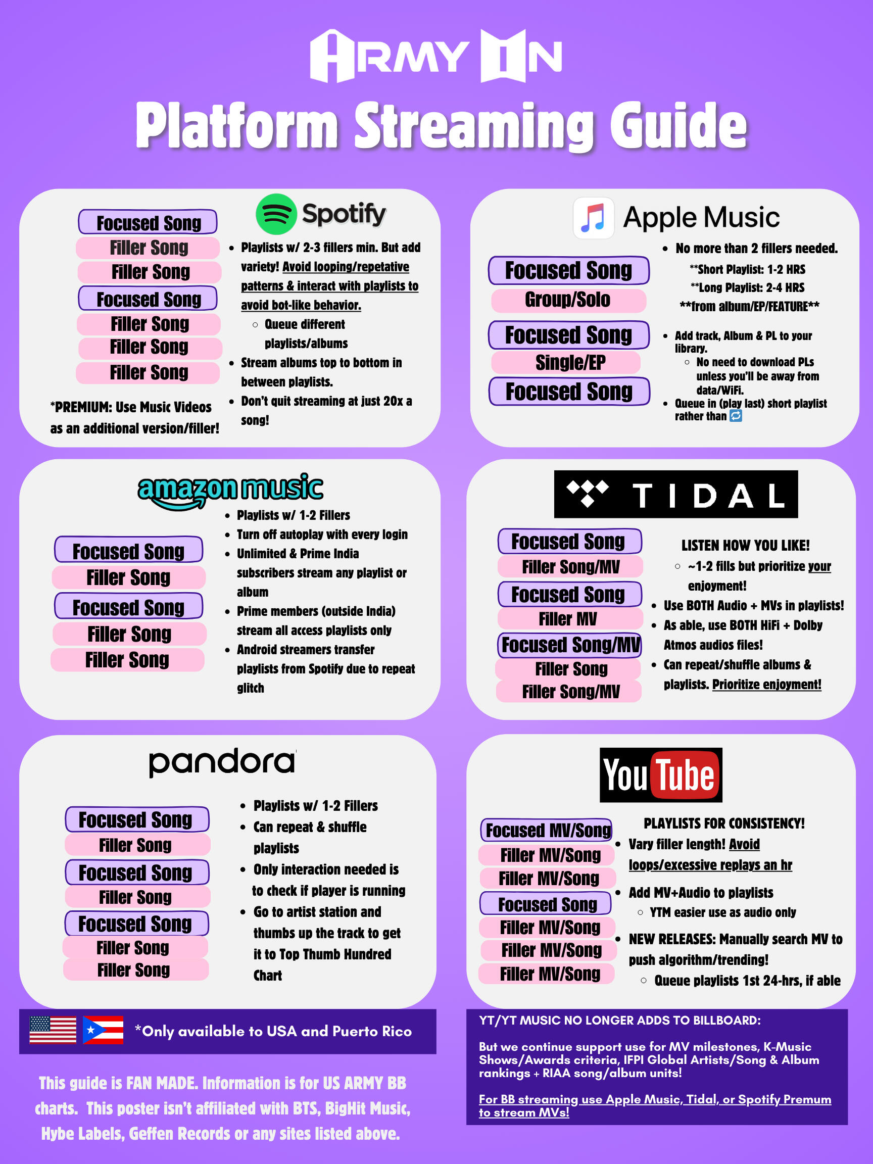 | Pandora (US only) | ARMYonPandora/ARMYonPandas | ARMYonPandora/ARMYonPandas | ARMYonPandora/ARMYonPandas | ARMYonPandora | ARMYonPandora /ARMYonPandas | - | - |